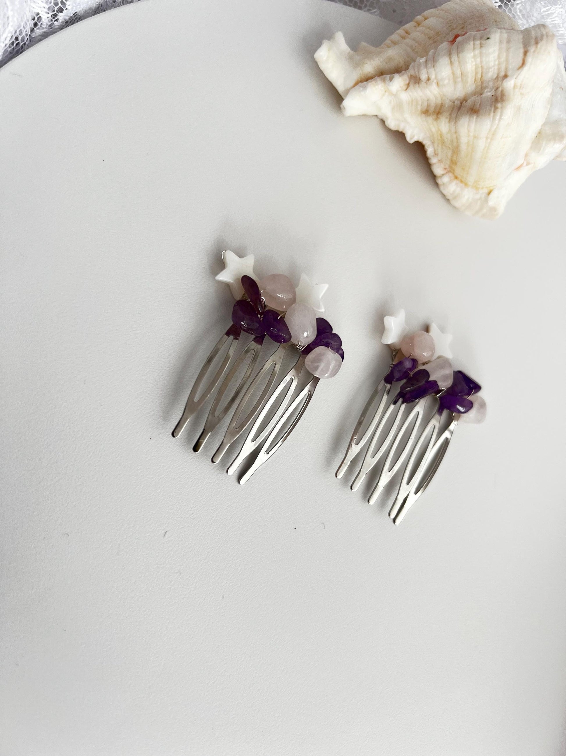 Adorn your hair with the enchanting beauty of this handcrafted nuggets amethyst hair comb, featuring delicate mother-of-pearl heart accents and sparkling preciosa silver seed beads. The natural amethyst stones add a touch of mystical charm, while the iridescent mother-of-pearl hearts and shimmering silver beads create a harmonious and elegant design.