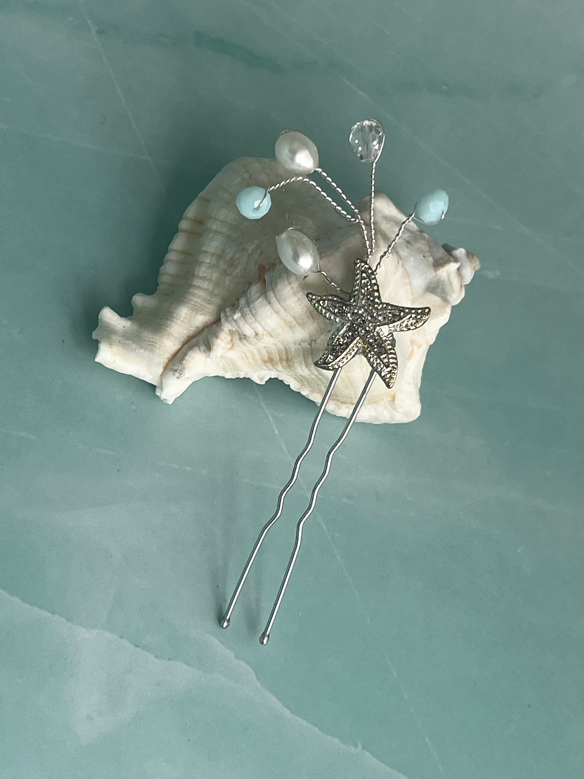 Bring a touch of coastal elegance to your hairstyle with this enchanting starfish hair pin, adorned with delicate pearls and shimmering blue crystal beads. Perfect for beach weddings, destination brides, mermaid-inspired looks, or anyone who loves ocean-themed accessories.