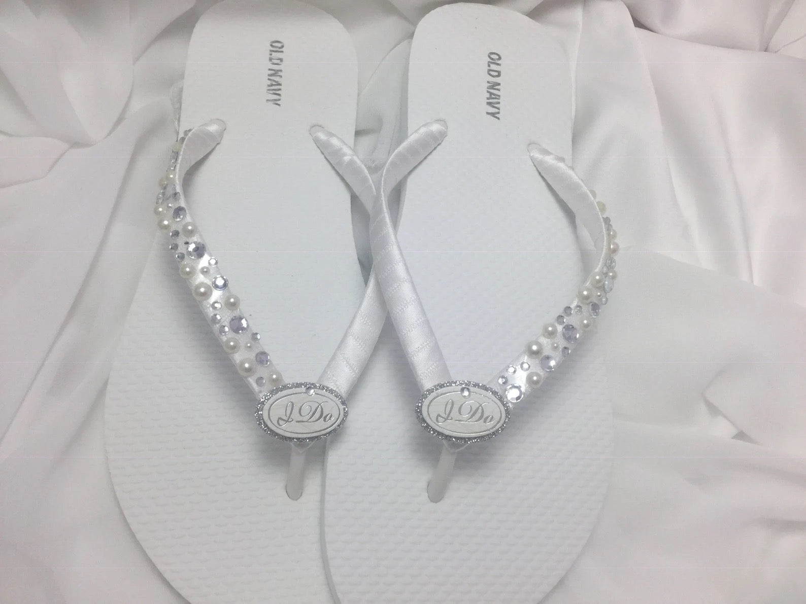 Beautiful white flip flops is wrapped with white satin ribbon and adorned with a silver tone I Do button. The straps are embellished with a strip of pearls and rhinestones. Ribbon is white if you needing other color please let me know.