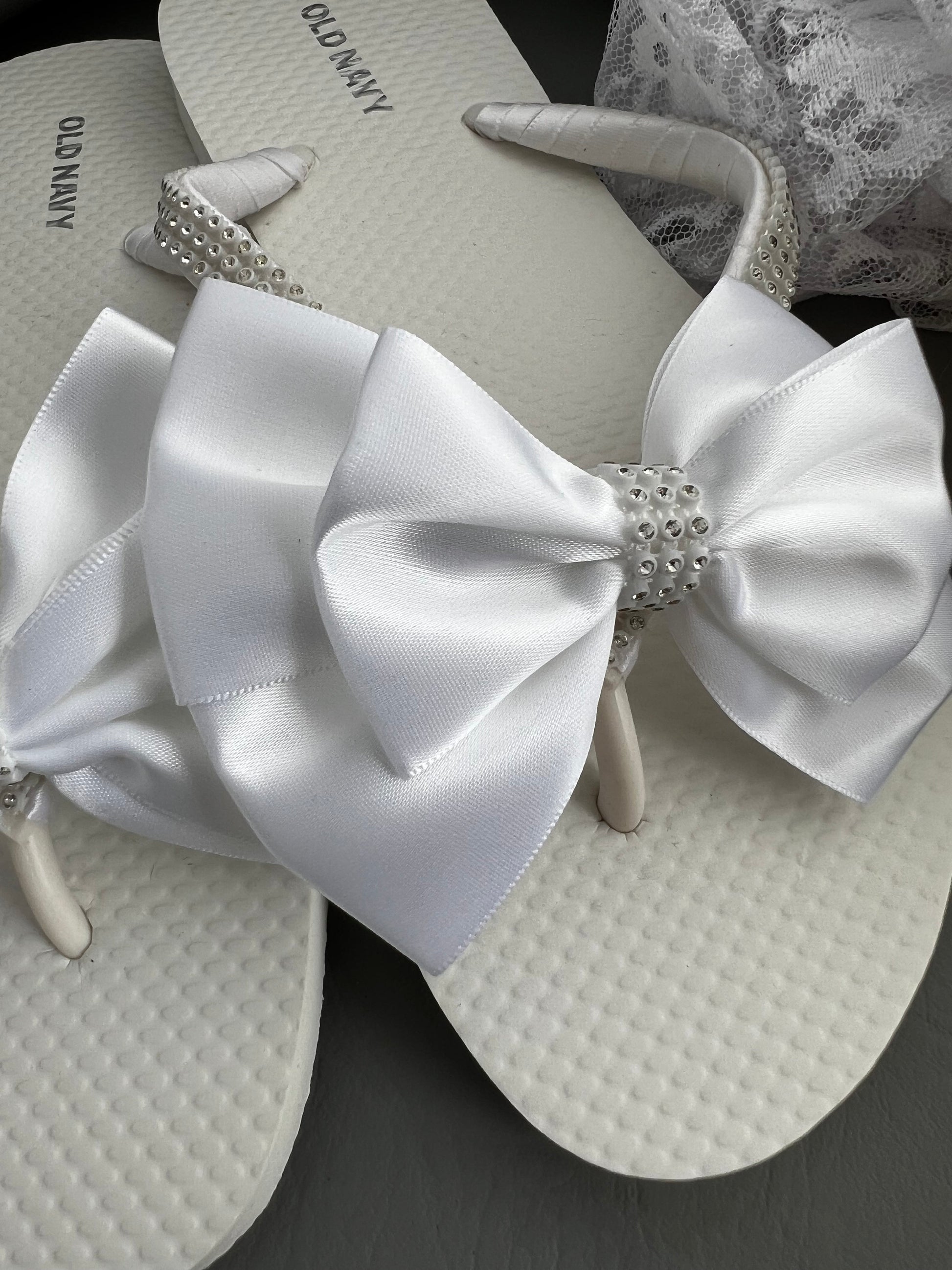 These beautiful flip flops are wrapped with a white satin ribbon, and adorned with a white handmade satin bow with a white and faux rhinestones strip on both sides of the straps.